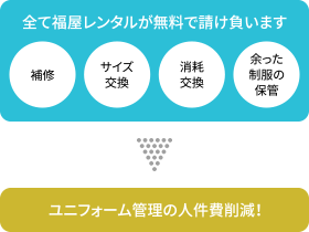 「人数×レンタル単価」だけでずっとお支払いが一定です。追加購入、サイズ交換、消耗交換、補修なども全て0円でお任せください。 -